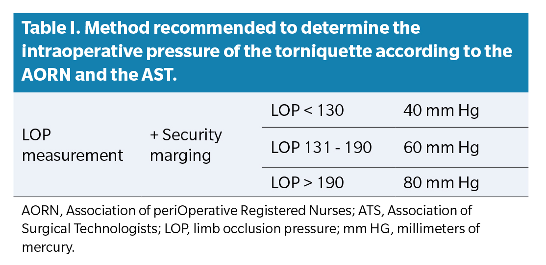 However, in recent years, the concept of LOP (limb occlusion pressure) has been developed, defined as the minimum pressure of the tourniquet to stop arterial flow distal to it, which would be the tourniquet pressure required to maintain a bloodless surgical field.(12) The Association of periOperative Registered Nurses (AORN) and the Association of Surgical Technologists (ATS) in the United States recommend calculating this value and using it as a system to estimate the intraoperative tourniquet pressure, with an added safety margin of 40, 60, or 80 mm Hg, depending on whether the LOP value is less than 130 mm Hg, between 131 and 190 mm Hg, and greater than 190 mm Hg, respectively (Table 1). (12,13). This system is known as the LOP method for calculating the intraoperative tourniquet pressure in each specific patient.
