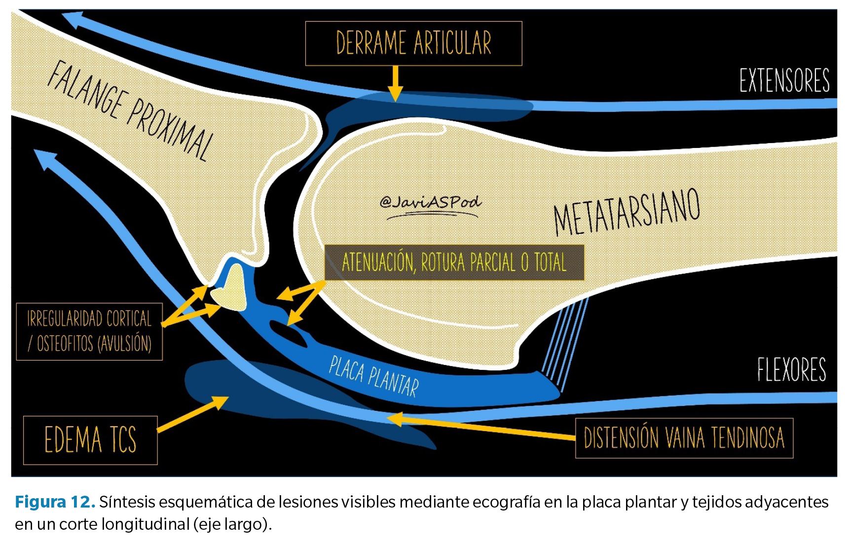 La placa plantar de las articulaciones metatarsofalángicas menores juega un papel fundamental en la estabilidad digital, manteniendo la correcta alineación del dedo con su metatarsiano y actuando asimismo de punto de anclaje para el resto de estructuras estabilizadoras de dicha articulación. La lesión de este ligamento especializado precipita la deformidad de los dedos menores, en especial el segundo, y es un motivo de consulta habitual en la clínica podológica. En el presente artículo realizamos una revisión pormenorizada de sus características anatómicas e histológicas, sus funciones mecánicas y mecanismos lesionales, así como su exploración clínica y mediante pruebas de imagen, dedicando un apartado especial a la ecografía que se ha erigido en la última década como un recurso accesible y cada vez más habitual en las consultas de podología. Gracias al uso de esta técnica podemos realizar un diagnóstico económico, en tiempo real, dinámico y más preciso del tipo de lesión que se presenta en la placa plantar o en los tejidos adyacentes, desde pequeñas distensiones hasta roturas parciales o completas acompañadas de un mayor o menor daño óseo e inflamación en los tejidos blandos periféricos, como la grasa plantar o los tendones flexores. La caracterización de las lesiones permite correlacionar mucho mejor la etiología con la lesión, así como establecer la mayor o menor necesidad de tratamiento y un pronóstico más certero para cada paciente.
