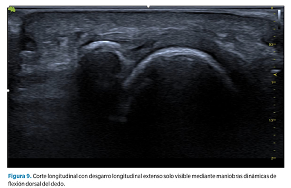 Como se ha señalado, en todos los casos las maniobras dinámicas de tensión del dedo (y la placa) son esenciales para establecer la presencia o no de un desgarro y su magnitud41,42. La incapacidad de tensar la placa (pasar de su estado curvado a un estado lineal) así como la pérdida de movimiento congruente entre la falange proximal y la placa son signos muy sugerentes de desgarro que solo pueden apreciarse mediante dichas maniobras.