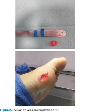 En el presente caso se utilizó una plasta en “S” para su extracción en vez de una excisión clásica fusiforme de la misma. Las ventajas de esta técnica incluyen una ampliación del campo de visión del cirujano, facilita la disección de estructuras profundas, permitiendo una resección tumoral más segura, y facilita el cierre de la misma reduciendo tensión sobre la cicatriz creada. Esta plastia ya ha sido descrita para el abordaje de diversas lesiones en el pie17. El caso presentado curó satisfactoriamente a las 3 semanas por medio de esta técnica con un resultado estético favorable.