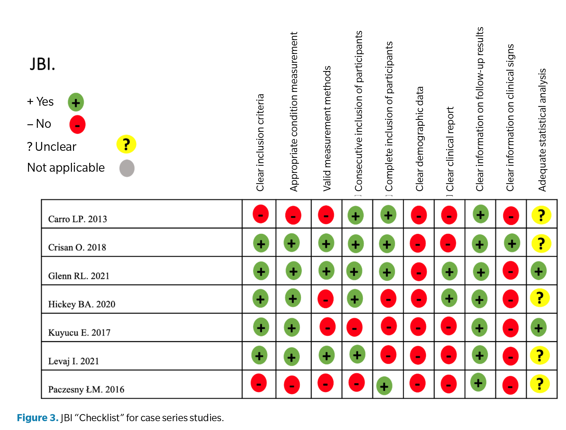 The JBI “Checklist for Case Series” (7) was used to control the quality and risk of bias of the studies. This qualitative analysis involves 10 sections evaluating: clear inclusion criteria for the case series, standardized and reliable condition measurement for all participants, valid methods to identify the condition in participants, consecutive inclusion of participants, complete inclusion of participants, clear demographic data of participants, clear clinical reports of participants, clear information on follow-up outcomes, clear information on the clinics where the study is conducted, and appropriate statistical analysis. Each section was categorized as “Yes” (low risk of bias; +), “Unclear” (moderate risk of bias; ?), “No” (high risk of bias; -), or not applicable as per the corresponding case (Figure 3). Studies were classified as high risk of bias if there were fewer than 50 % “Yes” responses, as moderate risk of bias if the proportion of “Yes” responses was 51-70 %, and as low risk of bias if there were more than 71 % “Yes” responses (Figure 4).