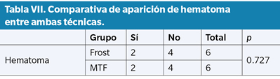 • Hematoma: En cuanto a la aparición de hematoma, se obtuvo el mismo número de casos en ambos grupos. Los valores estadísticos han designado un valor de p = 0.727 (Tabla VII).