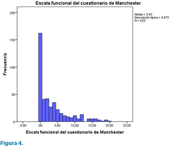 En el cuestionario de Manchester se analizaron la dimensión Función y dimensión Dolor. Los datos obtenidos al puntuar las respuestas muestran unos valores medios en la dimensión Función de 3.43 ± 4.47 con una mediana de 2 y en un rango de 0 a 20 puntos. En la dimensión Dolor la media es de 2.17 ± 2.60 con una mediana de 1 en un rango de 0 a 10 puntos. Las Figuras 4 y 5 muestran la distribución de las puntuaciones en las dimensiones Función y Dolor, evidenciándose que no siguen una distribución normal y que la puntuación más frecuente se encuentra en ambas dimensiones en valores inferiores a la media.