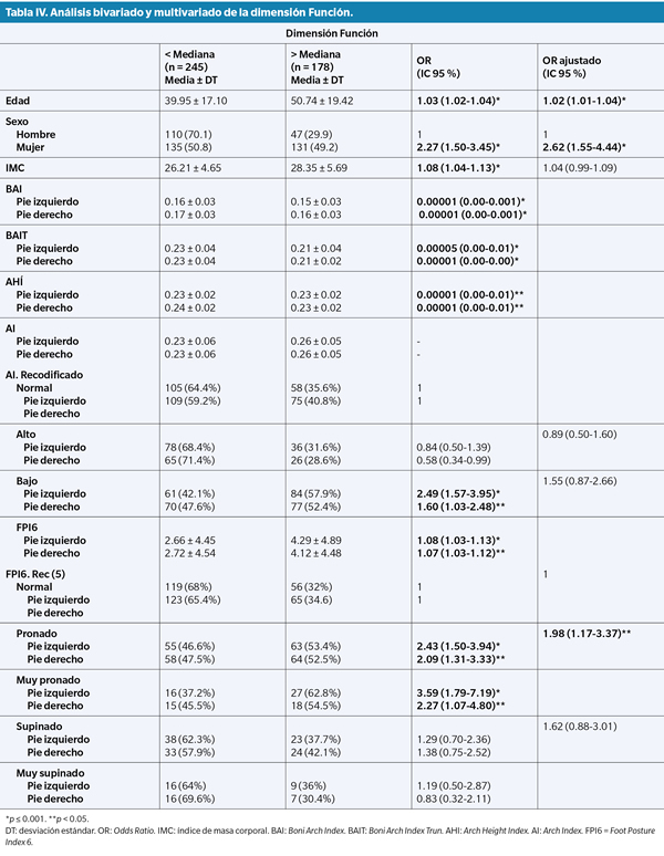 Results: In the function dimension, female sex (OR adjusted = 2.62 95 % IC 1.55-4.44, p < 0.001) and having at least one foot pronated or very pronated, (OR adjusted = 1.98; 95 % IC 1.17-3.37, p = 0.011), appeared as independent factors that influenced obtaining scores above the median. In the pain dimension, age (OR adjusted =1.02; 95 % IC 1.01-1.03, < 0.05), female sex (OR adjusted = 2.52, 95 % IC 1.52-4.19, p < 0.001) and presenting flat footprint morphology (OR adjusted = 2.10, 95 % IC 1.21-3.67, p < 0.05) were the significant variables to the group with scores higher than the median.