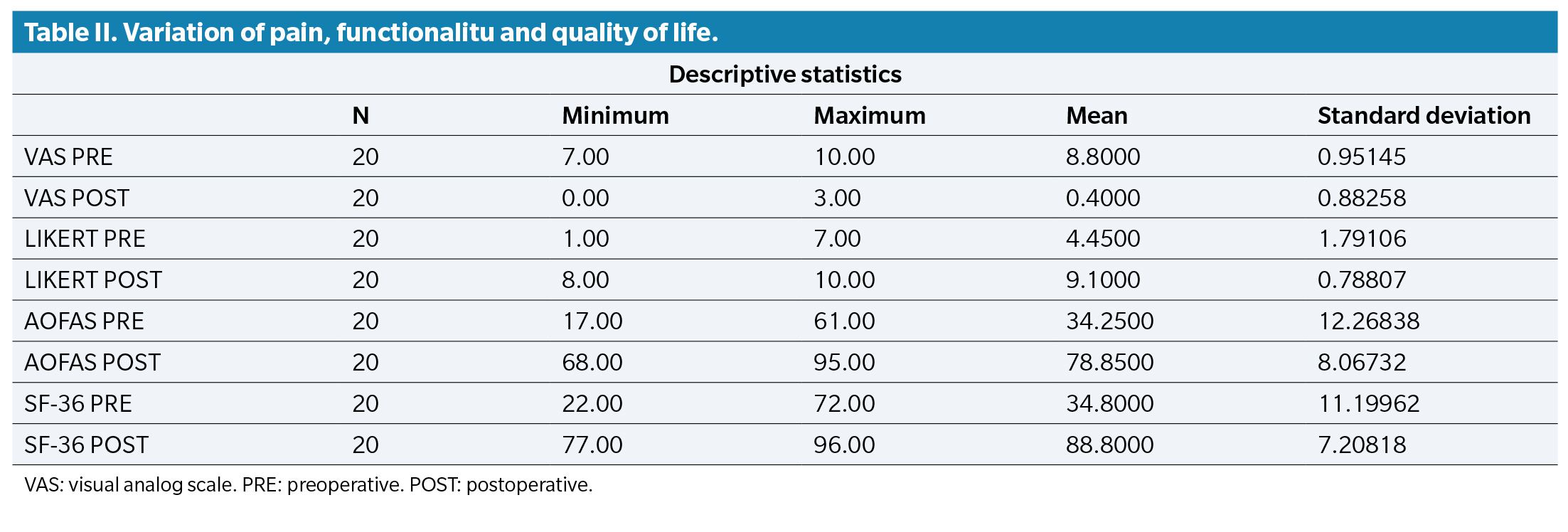 A descriptive analysis of the data was performed. Qualitative variables were expressed as frequencies and their percentage, while the quantitative ones were expressed as mean and standard deviation (SD). A significance test of the null hypothesis was performed using the Student t test for paired samples of the means (preoperative and postoperative) of the scales used in data collection (EVA, Likert, AOFAS, and SF-36).