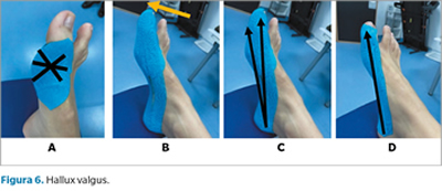 Como se ha tratado anteriormente se realizará una técnica de corrección funcional con el fin de llevar la articulación a su posición anatómica. Lo primero es corregir la deformidad, por lo que se llevará activamente el hallux (o en su defecto pasivamente) a la posición de corrección (6B) y a continuación se colocará la tira del VNM desde inframaleolar (zona ápex calcáneo) hasta hallux; se puede colocar la tira en “Y” (6C) o en “I” (6D). En muchas ocasiones, se cierra el vendaje abrazando la zona metatarsal, si existe mucho dolor, con el fin de liberar espacio. Además, si existe dolor, se puede poner un vendaje en estrella (6A) sobre la zona del bunion para aumentar espacio y reducir más si cabe el dolor7, dicho VNM se dividirá de 3 a 6 tiras en estrella, en función de lo grande que sea el pie, al igual que se hacía en la técnica de estrella del neuroma de Morton (4A).