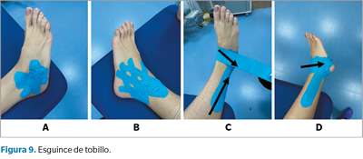 Una tercera tira para la estimulación de los mecanorreceptores de la zona lesionada, proporcionando información propioceptiva que hará que el cuerpo genere acciones correctoras (tanto estáticas o posturales como dinámicas), mejorando la propiocepción de la zona de lesión1. Empezando desde borde lateral peroné, un tercio superior, bajando por inframaleolar abrazando el talón con una tensión será del (75-100 %) al pasar por la zona del ligamento afectado (9C), buscando también la corrección de la articulación y del 25-35 % mientras rodeamos la articulación lesionada, que se encontrará en posición anatómica, acabando con ligera tensión en la zona del esguince (9D).