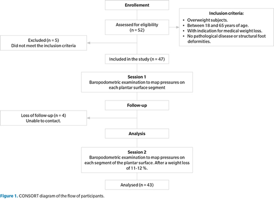 Participants were recruited at one Endocrinology and Nutrition private clinic in Huesca, Spain. Fifhty-two subjects were recruited, of whom five were excluded because they did not meet the inclusion criteria. At the start of the study, 47 participants were recruited, of which 4 could not be contacted again. Finally, the study was conducted on a sample of 43 patients (Figure 1), 24 were men and 19 women, mean age 48 ± 12.6 years (range, 19-64 years), apparently without pathological gait disease or severe structural or functional deformities in the feet. Inclusion criteria included overweight subjects between 18 and 65 years old, medical weight loss indicated, no lower limb or spine pathology that might affect normal gait, nor structural or functional deformities in the feet. Candidates who did not comply inclusion criteria or reported pain in their feet within the previous 6 months or had any previous foot surgery were excluded.