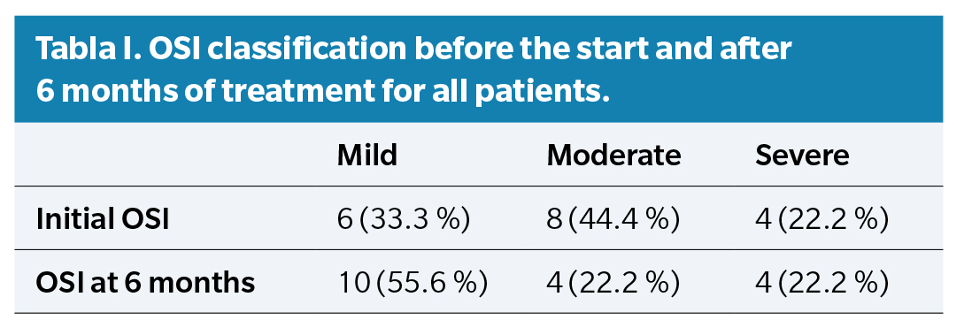 The results of the initial and final OSI for all patients can be seen in Table 1. There was a statistically significant improvement (p value = 0.012) in the initial and final OSI for all patients, regardless of the treatment received (Figure 1). Additionally, there was an increase in the frequency of mild classification and a decrease in moderate cases, while severe cases remained constant.