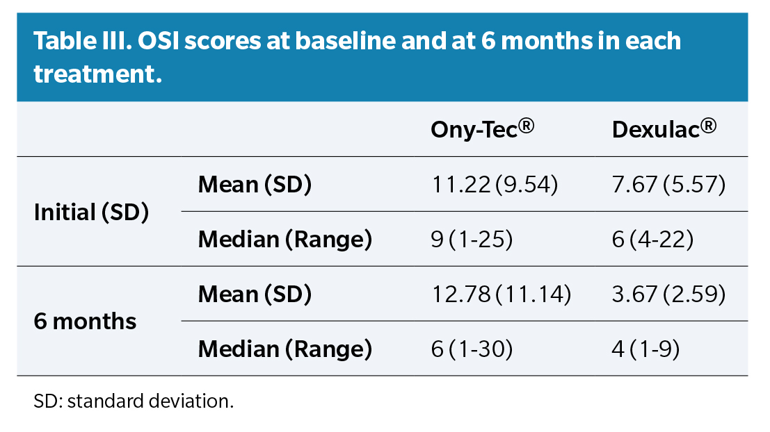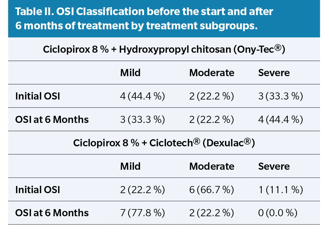 As far as we know, this is the first study reporting mean scores and changes in OSI classification at the start and after 6 months of treatment with these 2 products, without finding statistical differences between treatments. The results regarding the frequency and percentage of mild, moderate, and severe cases before the start and after 6 months of treatment by groups (Table 2) may suggest that improvements were greater in the group treated with ciclopirox 8 % + ciclotech®, with a higher number of mild cases and a greater reduction in moderate and severe cases by the end of the study vs the other treatment group (0.061), which we believe might be due to initially including more severe cases treated with ciclopirox 8 % + HPCH, possibly introducing a bias in the results.
