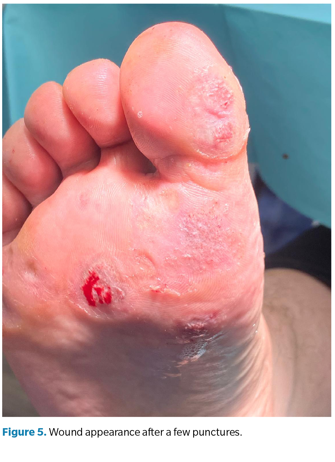 Debridement of the hyperkeratosis was performed with a scalpel before the multipuncture technique. Then, using a 25 G ? needle, punctures were made across the surface of the wart (Figure 4). By targeting the papilloma through the immune system, treatment was applied only to the right foot, as a positive response to the therapy could lead to spontaneous resolution of the contralateral foot. This foot was chosen because it was the most affected one, with a higher likelihood of addressing the primary lesion.