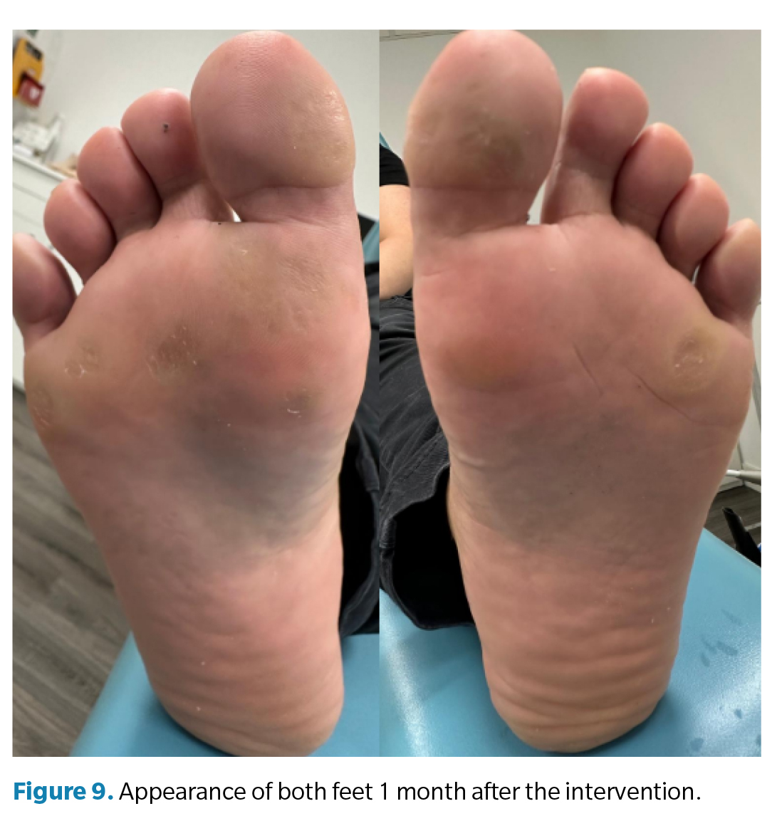 The improvement in appearance is increasingly evident, particularly in the contralateral foot. Hyperkeratosis was debrided from the untreated foot (Figure 9).