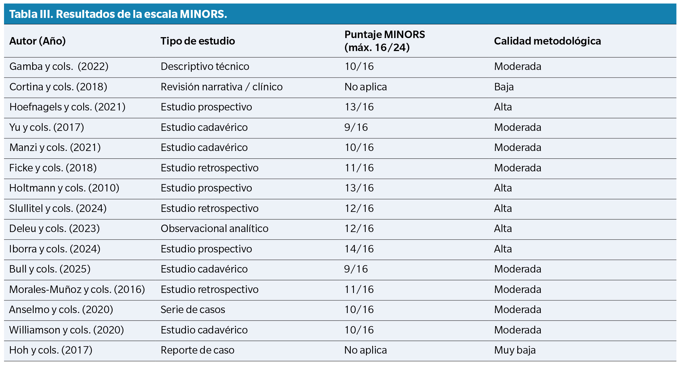 La calidad metodológica de los estudios incluidos se evaluó utilizando herramientas adaptadas al diseño de cada investigación. Para los estudios no aleatorizados, se empleó el MINORS (Methodological Index for Non-Randomized Studies), mientras que en los estudios observacionales y cadavéricos se aplicaron criterios descriptivos centrados en la validez externa y el riesgo de sesgo.
