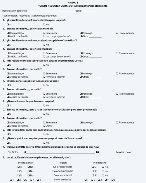 Se recopilaron datos sociodemográficos incluyendo la edad, el sexo, la raza y la duración media de la enfermedad. Se administraron los cuestionarios Systemic Lupus International Collaborating Clinics/American College of Rheumatology (SLICC)(16) y Systemic Lupus Erythematosus Disease Activity Index (SLEDAI) (17). Se confeccionó una hoja de recogida de datos donde se registró información acerca del dolor en los pies y su localización atribuidos al LES en el momento de la entrevista, registrando la puntuación de dolor mediante una escala visual analógica. Se registró si habían recibido consejos o cuidados en el caso de que tuvieran problemas en los pies, y qué profesional se los ha proporcionado. También, si habían recibido consejos sobre cuál era el calzado adecuado para sus problemas de pies y qué profesional se lo había proporcionado. Por último, se les preguntó si estaban usando ortesis plantares, calzado ortopédico o “a medida” en la actualidad, y que profesional se lo ha prescrito (Anexo 1).