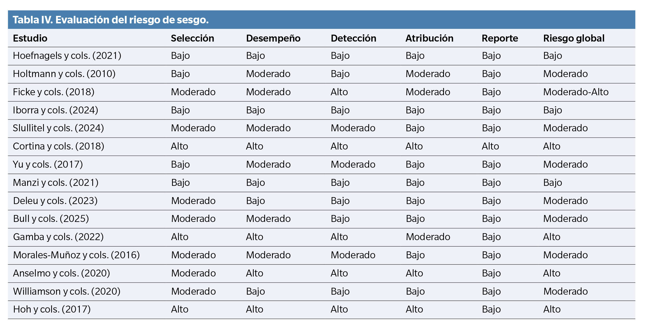 El riesgo de sesgo (Tabla 4) se valoró cualitativamente en 5 dominios: selección, desempeño, detección, atribución y reporte. Se categorizó como bajo, moderado o alto en cada dominio, considerando el riesgo global como el valor más frecuente o el más grave entre los dominios evaluados.