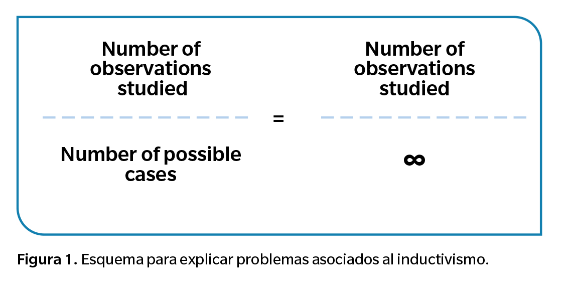 However, although induction may be a path for advancing scientific knowledge, the history of science has shown that scientific theories do not tend to be formed through induction. Karl Popper, in his work Logik der Forschung (1935) (The Logic of Scientific Discovery), strongly criticized inductivism, disagreeing with it as a system for advancing science. The major problem associated with inductivism is what is known as the “inductive leap”: moving from particular observations to a universal law or theory involves an almost insurmountable leap of faith. Why? If we consider past observations of a given phenomenon and the future observations of that same phenomenon in the universe, the number of observations is infinite or tends toward infinity. Our observations of a repeated phenomenon, regardless of how many they are, will always be zero when compared with all the observations that have occurred and will occur in the universe regarding that same phenomenon, because the denominator is infinite (Figure 1). Inductive reasoning is based on the assumption that observed cases are representative of all cases, and for Popper this assumption is a common source of error or logical fallacy. If we consider past cases throughout history and future cases of infected diabetic foot ulcers, the number of observations supporting a hypothesis is irrelevant, because it will always be negligible compared with the total potential number of cases (past and future).