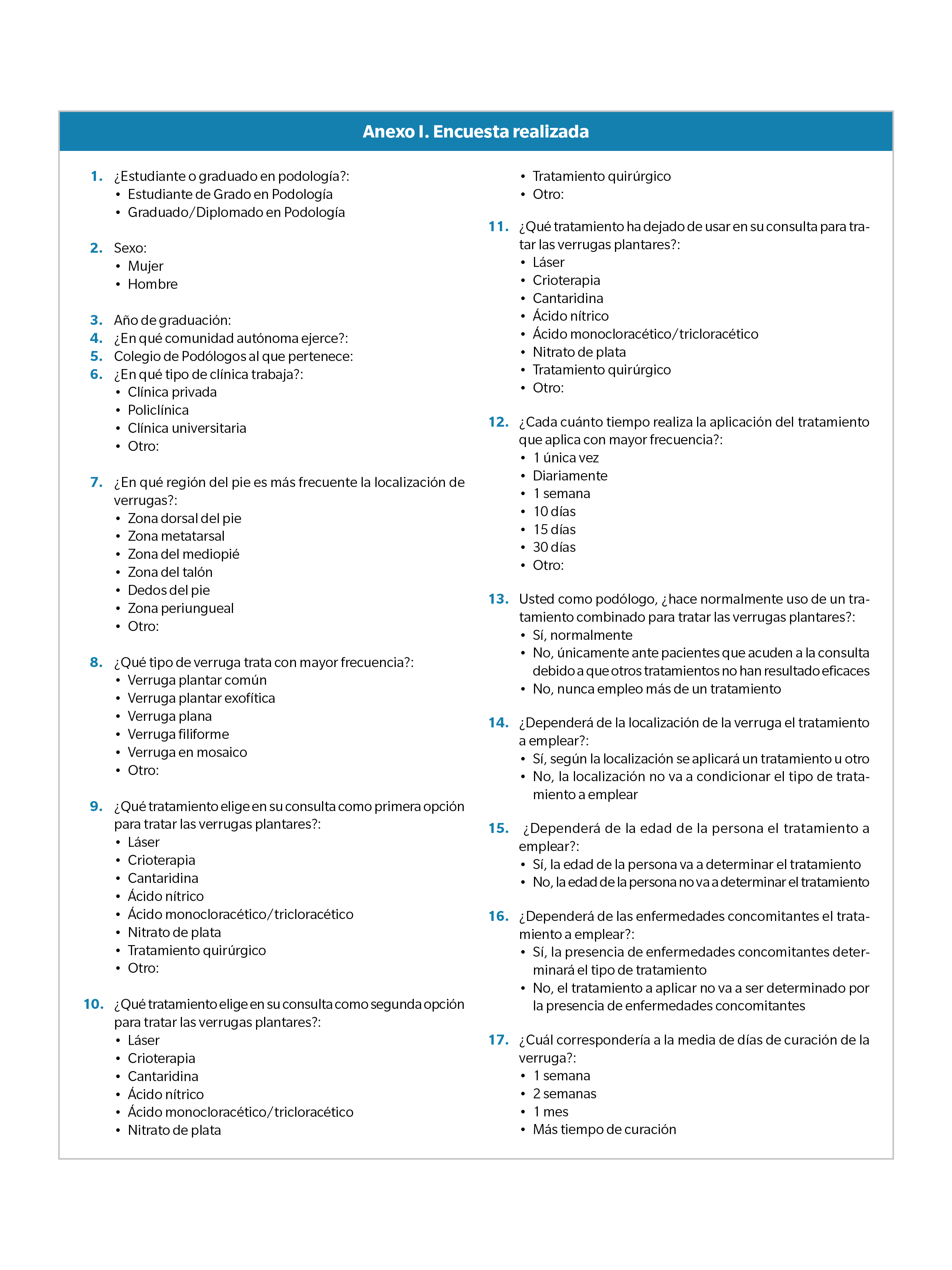 Se diseñó una encuesta con 17 preguntas en formato electrónico (Google-Forms, ver Anexo I), con el objetivo de obtener datos sobre el uso de los diferentes tratamientos físicos y químicos en el tratamiento de las verrugas plantares en España. Para analizar un posible cambio en la frecuencia de uso de cada uno de los tratamientos evaluados, se diseñó un estudio descriptivo, longitudinal y prospectivo, de acuerdo con los principios de la Declaración de Helsinki, y se obtuvieron datos en dos periodos temporales diferentes: año 2016/2017 y año 2021/2022. La encuesta fue enfocada para que la cumplimentaran podólogos, por ello fue enviada a todos los Colegios de Podólogos de España, para la difusión entre sus colegiados.