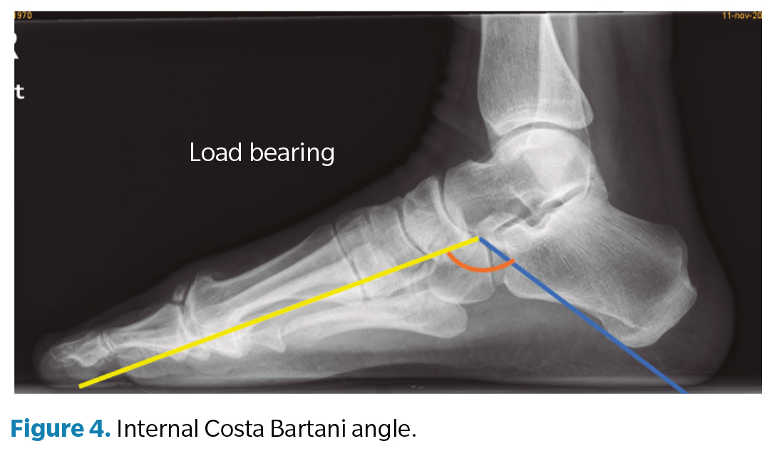 Regarding the goniometric variables in the lateral X-ray, the following angles were obtained: first metatarsal inclination angle, calcaneal inclination angle, Meary-Tomeno line, and internal Costa Bartani angle. The metatarsal inclination angle or Fick angle involves the inclination of the 5 metatarsals; however, for this study, only the inclination angle of the first metatarsal was considered (Figure 1), which was defined by the diaphyseal axis of the first metatarsal with the horizontal plane of the ground support11. The calcaneal inclination angle (Figure 2) is defined by the axis of the calcaneus, a line connecting the calcaneal tuberosity to the plantar margin of the anterior extension of the calcaneus near the calcaneocuboid joint, and the support plane (line formed by the proximal plantar tuberosity of the calcaneus and the head of the 5th metatarsal). A value of 20° is considered normal(12). The Meary-Tomeno line (Figure 3) is defined as the line passing through the axis of the talus (bisector of the angle formed by the tangent to the superior and inferior borders of the talus) and the axis of the diaphysis of the first metatarsal13). The internal Costa Bartani angle (Figure 4) is defined as the union of 3 points: the lowest point of the medial sesamoid, the lowest point of the posterior tuberosity of the calcaneus, and the lowest point of the talonavicular joint(14)..