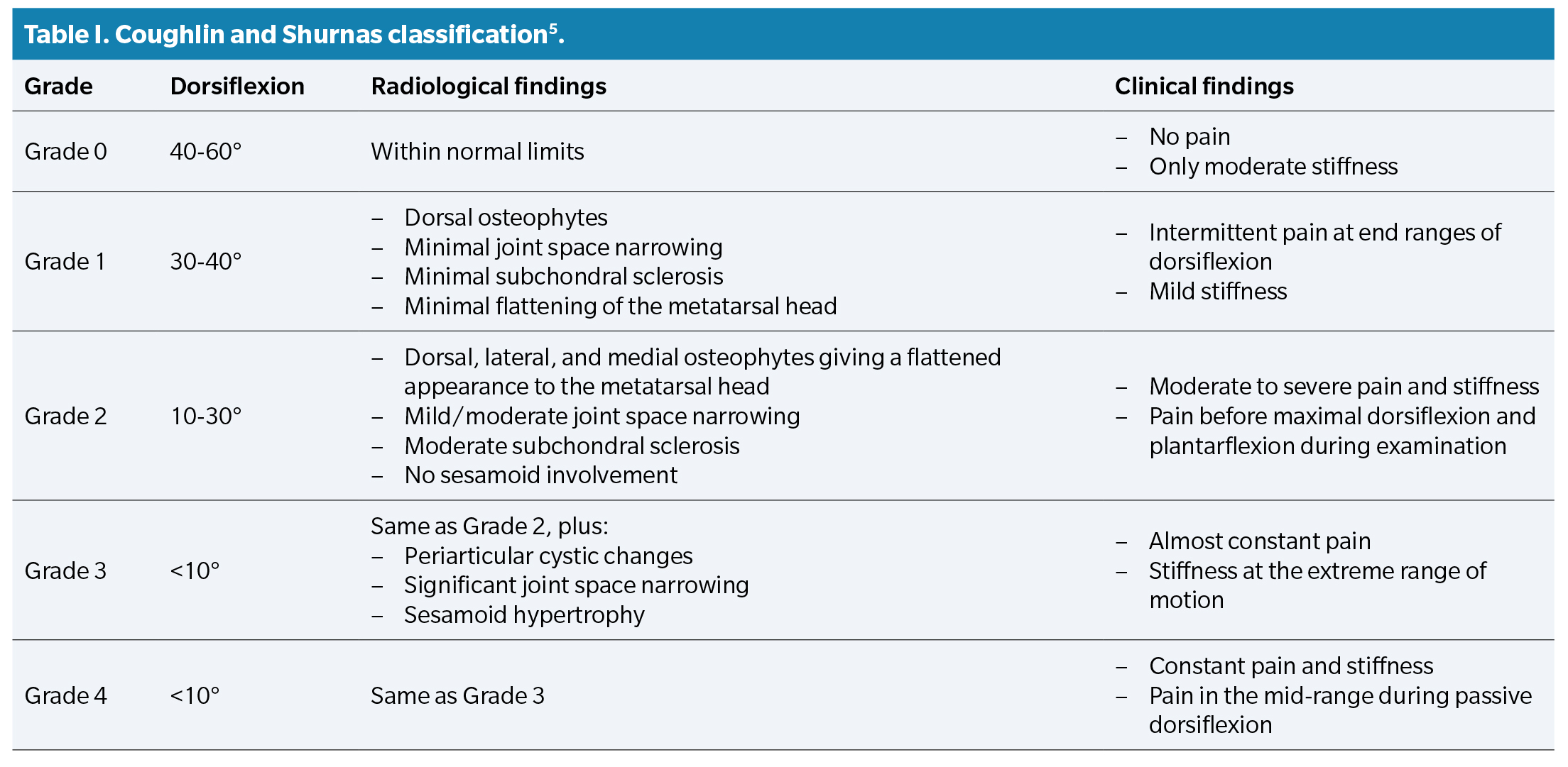 On the other hand, the diagnosis of HR disease is based on clinical and radiological findings. The most common clinical findings in the diagnosis of HR are pain and limited joint mobility of the 1MTPJ, and the radiological findings include the formation of dorsal osteophytes on the head of the first metatarsal, presence of cysts and subchondral geodes, existence of subchondral sclerosis, involvement of the joint space, sesamoid disorders (including avascular necrosis), or bone lesions following trauma(4).. Based on the results of reliability and validity studies, the literature recommends using the Coughlin and Shurnas classification as the gold standard for the diagnosis and classification of HR(2,5) (Table 1).