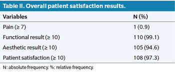 Regarding overall patient satisfaction, a very low postoperative pain and high functional and aesthetic outcomes, as well as high patient satisfaction were recorded (Table II).