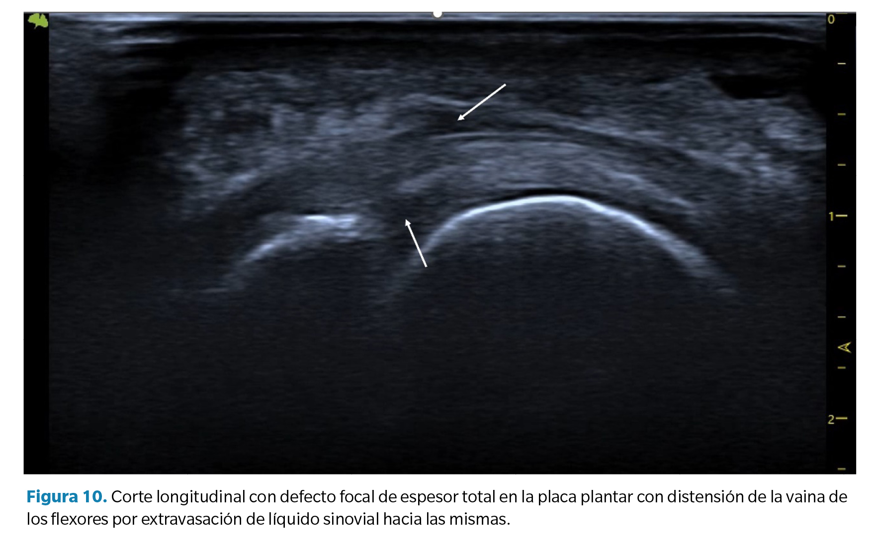 2. Aplanamiento y atenuación de la placa plantar. En estos casos no se observa un defecto de forma tan clara, pero debe llamarnos la atención cuando la zona de inserción, generalmente más gruesa, se aprecia más adelgazada que la zona media o proximal de la placa. Esto sugiere generalmente la presencia de un desgarro transversal que abarca desde la porción lateral hasta la porción central de la placa40 (Figura 9).