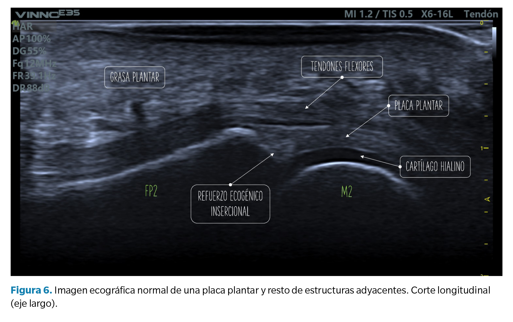 En la unión con la falange proximal, bien definida, el contorno óseo es normalmente liso y en la placa puede aparecer una zona triangular más ecogénica que se ha descrito como un hallazgo ecográfico normal y podría representar una mayor proporción de fibras de colágeno. La unión proximal al cuello metatarsal, en cambio, tiene una definición pobre en imagen ecográfica (Figura 6).