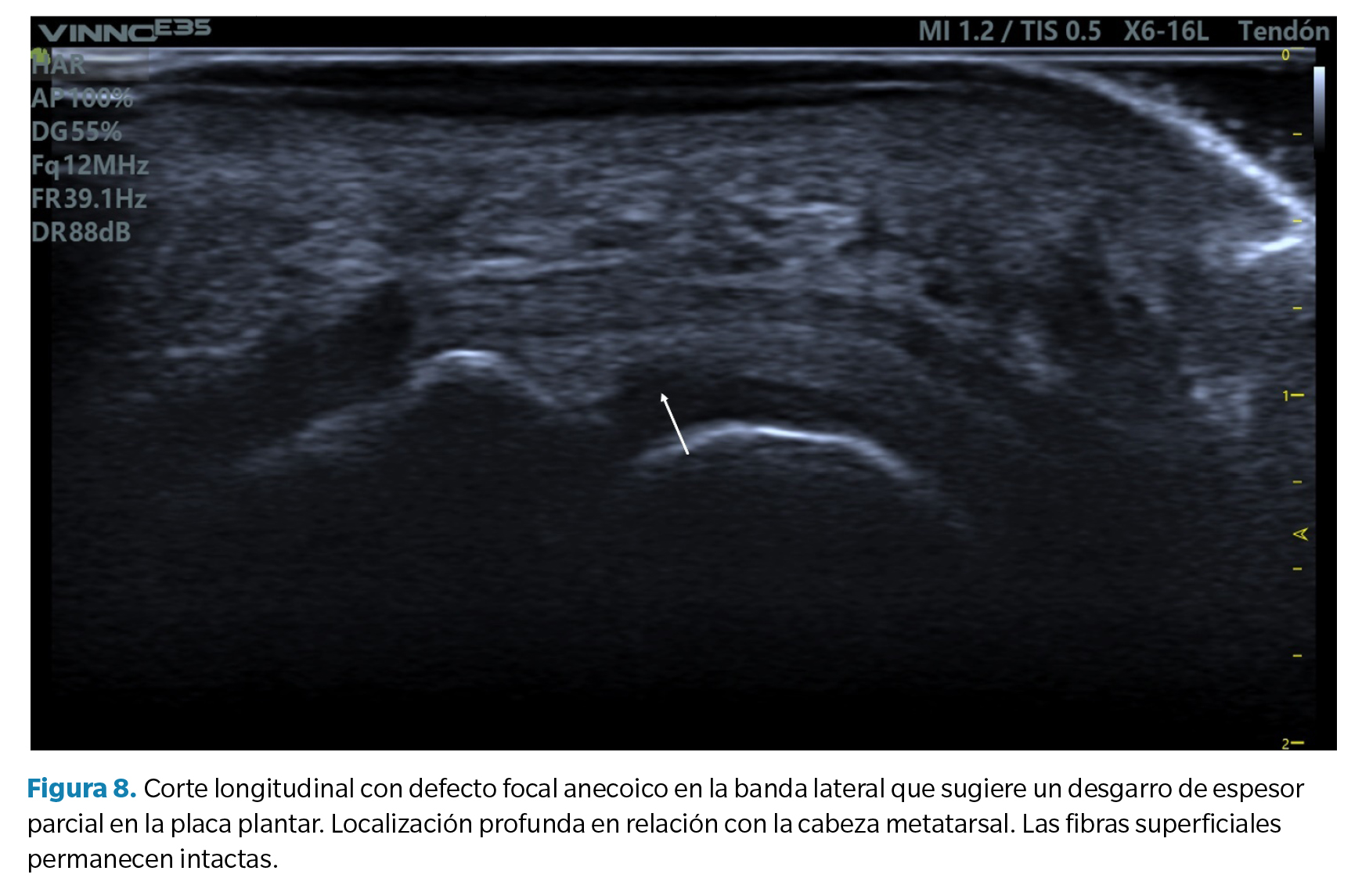 1. Defecto focal anecoico o hipoecoico. Se aprecian como una hendidura discreta en la zona profunda del tejido (zona que articula con la cabeza metatarsal) en su margen lateral. Cuando las fibras superficiales están intactas hablamos de un desgarro de espesor parcial, mientras que cuando dicho desgarro atraviesa todo el tejido hasta su región superficial hablamos de un desgarro de espesor total39 (Figura 8).