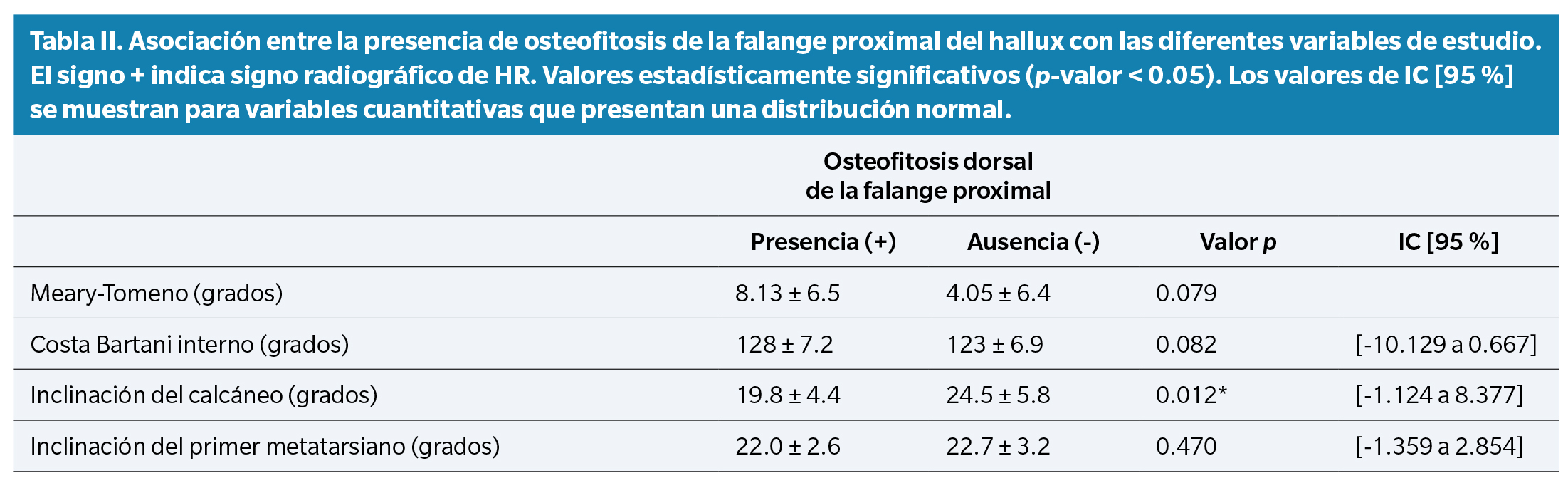 Los pacientes que presentaron osteofitosis dorsal de la falange proximal (n = 11; 30 %) tuvieron un ángulo de inclinación del calcáneo menor que aquellos que no presentaron osteofitosis (19.8° ± 4.4 vs. 24.5° ± 1.3; p = 0,021; IC [0.753 a 8.747]) (Tabla 2).