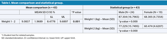 All participants came from Endocrinology and Nutrition consultation and were overweight: mean weight for men 87 (range, 72-104) kg and 68 (range, 62-75) kg for women, with a Body Mass Index (BMI) higher than 25. The mean comparison of the two weights studied is shown in Table I. The loss of weights between both times was statistically significant (p < 0.05). As well there can be observed the weight differences between genders which had no statistical significance.