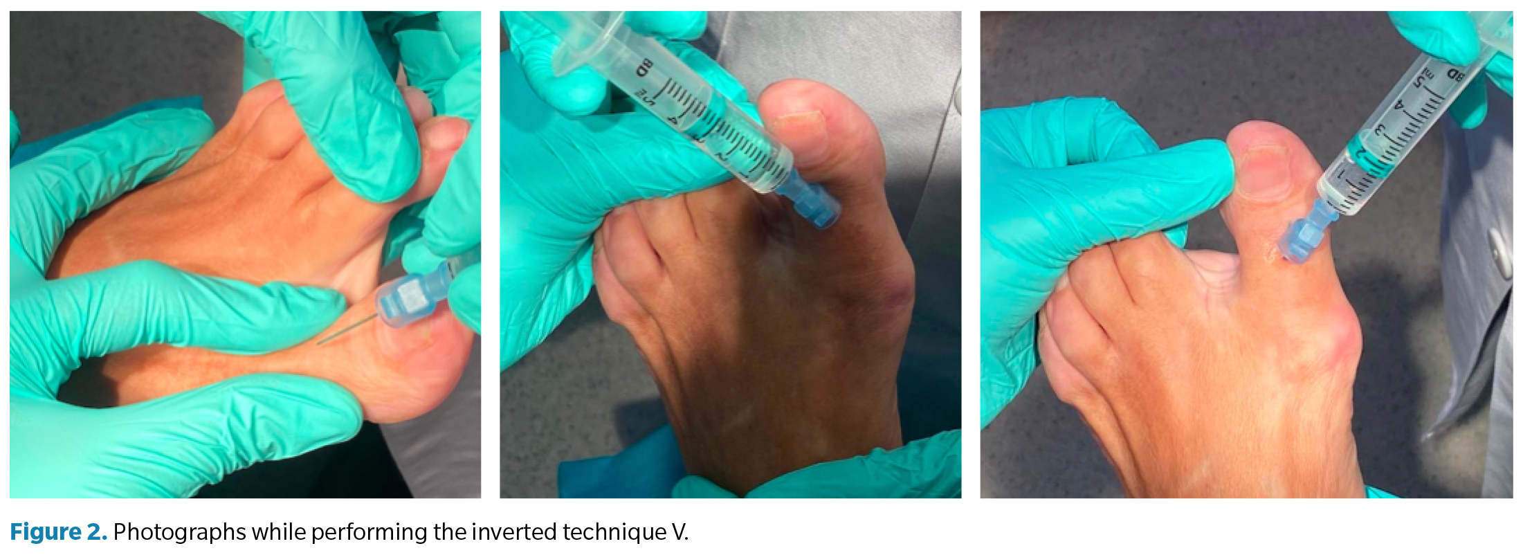 Introduction: First toe surgery is a common procedure used to treat various conditions, such as onychocryptosis, subungual exostoses, and osteochondromas. A crucial step before surgery is the complete anesthetic block of the affected toe. Currently, the standard technique to achieve this block is the H technique. In this context, our objective is to evaluate the inverted V technique and determine whether it offers advantages compared to Frost’s H technique.