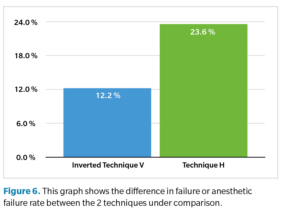 The anesthetic failure rate was calculated 20 minutes after the infiltration. If, after 20 minutes, the patient did not report anesthetic sensation, a “cork-like” sensation, or total loss of pain, additional injections, termed bailout injections, were administered. Results showed a failure rate of 12.2 % for Technique V and 23.6 % for Technique H, with two cases requiring two bailout injections. Figure 6 clearly demonstrates that the anesthetic failure rate is significantly higher for Technique H.
