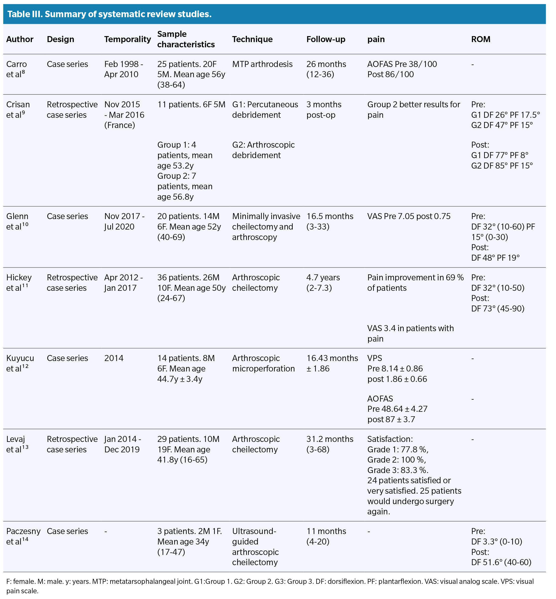 The studies presented evaluate different arthroscopically-assisted surgical techniques for the management of HR. Although each study has its own limitations, overall, an improvement in patient symptoms and an increase in MTP mobility after surgical interventions were observed, which is consistent with previously published studies(15,16,17).