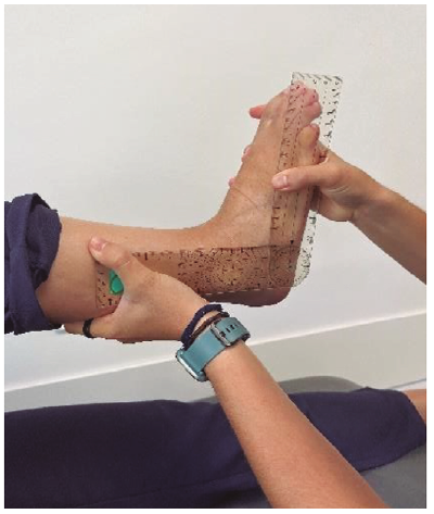 Las variables por medir fueron: flexión dorsal de tobillo con rodilla extendida y flexionada, extensión de la primera articulación del primer dedo. El protocolo de medición fue el siguiente. En primer lugar, la participante se colocó en decúbito supino en la camilla, se midió la flexión dorsal de tobillo con rodilla extendida y a su vez con rodilla flexionada, tal y como se muestra en la Figura 2. El centro del goniómetro se colocó en la cara externa de retropié, en el vértice del maléolo externo, una de ramas del instrumento estará paralela a la camilla pasando por la superficie ósea de la pierna y la otra al borde externo del talón recorriendo la línea hasta el quinto metatarsiano9. Posteriormente, la participante siguió en decúbito supino en la camilla y se procedió a medir la extensión de la primera metatarsofalángica, representada en la Figura 3. Se colocó el centro del goniómetro en el centro de la cabeza del primer metatarsiano, una de las ramas es paralela a la bisección del primer metatarsiano y la otra rama es paralela a la bisección de la falange proximal. Se cuantifica como la diferencia entre la posición de partida y la máxima dorsiflexión del mismo9. Todas las mediciones del estudio fueron realizadas de la misma forma en la camilla y con el mismo instrumento y por la misma investigadora (M.C.V.).