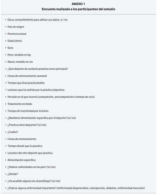 Patients and methods: Using a survey, we analyzed the sports injuries suffered in the lower extremity by 100 athletes who practice various contact sports. In addition to other variables such as sex, diet, hours of weekly training, and how long has been practicing it. To know if the same podiatric disorders occur in the different modalities or if they are different. The data was statistically treated using the Microsoft Office Excel 2013 and SPSS 22.0.