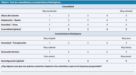 Tras la medición baropodométrica posterior a la carrera todos los participantes contestaron un test relativo a la comodidad, a través de una escala tipo Likert, que se puntúa de 1 a 5 (1 muy incómodo, 2 incómodo, 3 neutral, 4 cómodo y 5 muy cómodo). También se les preguntó sobre las características fisiológicas de los calcetines, como humedad, sensación térmica y amortiguación, se puntuó también del 1 al 5. Al final del test se les permitió una respuesta abierta (Tabla II).