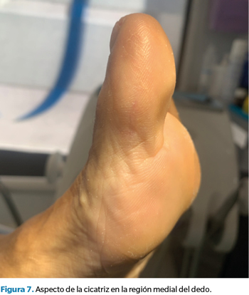 Antes de finalizar con el cierre de la herida, realizamos un control fluoroscópico para valorar la movilidad de la articulación y del osículo profundo, que quedó intacto y se observó cómo, en extensión del dedo, no tenía incidencia a nivel plantar, confirmando nuestra sospecha de que dicho osículo no era el responsable de la sintomatología que presentaba la paciente.