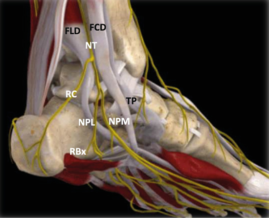 Figura 3. Túnel tibiotalocalcáneo. El nervio tibial (NT) se divide en la rama calcánea (RC), el nervio plantar medial (NPM) y el nervio plantar lateral (NPL) del que se escinde la rama de Baxter (RBx). Las estructuras musculotendinosas tibial posterior (TP), flexor largo del primer dedo (FLD) y flexor largo de los dedos (FCD) acompañan al nervio tibial en su recorrido por la cara medial del tobillo y el pie. Imagen modificada de la App Ankle & Foot Pro III.