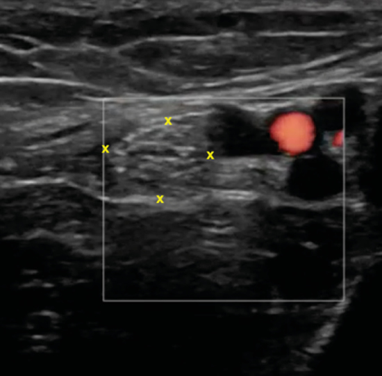 Figura 7. Examen en eje corto del nervio tibial (x) posterior adyacente a los vasos tibiales posteriores.