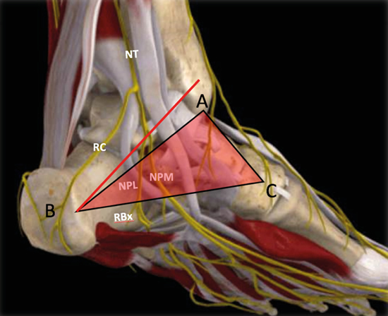 Figura 13. Línea de Dellon-Mackinnon (A-B) y triángulo de Heimkes (A-B-C). Se observan el nervio tibial (NT) y las ramas calcánea (RC), el nervio plantar lateral (NPL), el nervio plantar medial (NPM) y la rama de Baxter (RBx). Imagen modificada de la App Ankle & Foot Pro III.