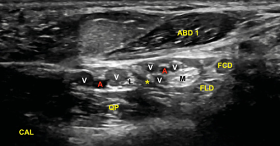 Figura 11. Imagen sonográfica de la diferenciación del nervio plantar medial (M) y del nervio plantar lateral (L) debajo de la arteria y venas (A, V) y sobre el tendón flexor largo del primer dedo (FLD). En superficie el retináculo flexor (*).
