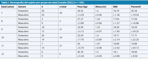 Se realizó un cribado según los criterios anteriores, obteniendo una muestra de investigación para este estudio piloto a 139 niños escolares, de los cuales 45 niños tienen 7 años, 3 niños 8 años, 31 niños 9 años, 34 niños 10 años, 21 niños 11 años y 5 tienen 12 años. Se indica la proporción de niñas y niños en cada grupo de edad, aunque no se realizó una separación por género para el estudio, ya que la bibliografía actual indica que no existe diferencia significativa de los parámetros espaciotemporales según el sexo en niños3,17 (Tabla I).