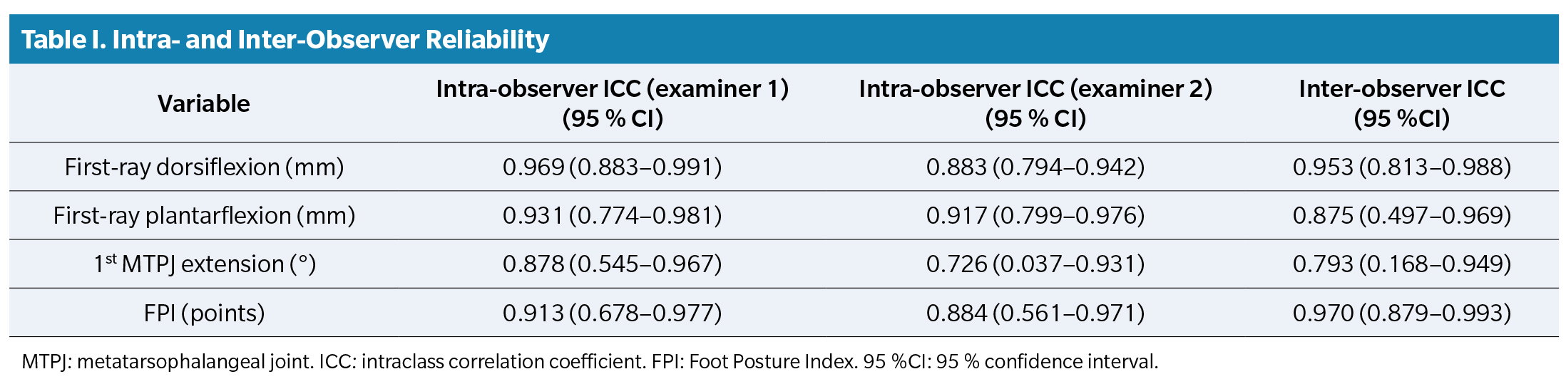 To assess reliability, inter-rater and intra-rater agreement was analyzed using the intraclass correlation coefficient. First-ray mobility, 1st MTPJ extension, and the FPI were measured in 10 randomly selected subjects by two investigators to determine inter-observer reliability. For intra-observer reliability, these same variables were evaluated twice, with a 20- and 30-day interval between measurements. A two-way mixed-effects model, consistency type, and average measures were used to calculate the intraclass correlation coefficient.