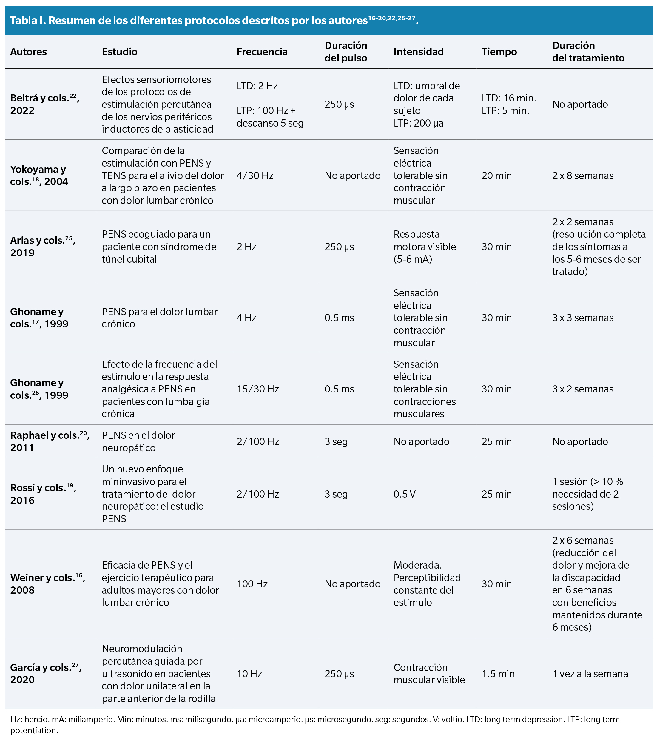 Los estudios realizados por Klein y cols.(23) y Sdrulla y cols.(24) sirvieron de sustento al ensayo clínico realizado por Beltrá y cols.(22), en el que pretendían evaluar los efectos sensoriales y motores de ambos protocolos en individuos sin patología previa para así determinar cuál de los dos resultaba superior en la reducción de la percepción dolorosa. Evaluaron los efectos de estos inmediatamente y 24 horas después de estimular el nervio mediano. Los autores desarrollaron un nuevo protocolo LTP basado en los hallazgos previos de Sdrulla y cols.(24). Descubrieron que, utilizando pulsos de 100 Hz en 5 ráfagas de 5 segundos separadas por descansos de 55 segundos, podían inducir una depresión sináptica sobre la vía nociceptiva sin necesidad de aumentar la frecuencia. A su vez, crearon un protocolo LTD que consistía en estimulación a 2 Hz durante 16 minutos. Como resultado se obtuvo que el protocolo LTP condujo a una hipoalgesia distal sin afectar al rendimiento motor ni producir ninguna percepción dolorosa. Por otro lado, el protocolo LTD no causó hipoalgesia, redujo la fuerza y los individuos si percibieron sensaciones molestas.