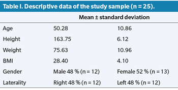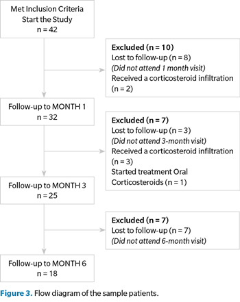 Figure 3 shows the flowchart of the patients who participated in the study. A total of 42 patients were initially included in the study of which 10 were excluded in the first month (8 did not attend the first visit and 2 cases were infiltrated by another professional during that period). Of the 32 cases evaluated at one month, 7 were excluded after 3 months (3 of them were infiltrated during the follow-up period by another professional, 1 case started oral corticosteroid treatment and 3 patients did not attend the successive consultations). Of the 25 cases evaluated at 3 months, 7 patients did not attend the 6-month follow-up, so that only 18 patients were evaluated at 6 months. Data analysis was performed on the cases available at 3 months (n = 25) for Friedman and Wilcoxon test comparisons. In the case of the 6-month comparison for the Friedman and Wilcoxon test, missing data (7 cases) were filled in with the median and RIQ of the 18 cases that completed the 6-month review. Table I shows the descriptive data of the study sample.