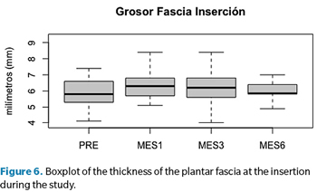Resultados: De los 42 pacientes inicialmente reclutados hubo pérdidas hasta llegar a 18 pacientes a los 6 meses. Se observó una disminución del dolor al mes, a los 3 meses y a los 6 meses, que fue estadísticamente significativa en todas las comparaciones. Se observaron diferencias estadísticamente significativas en el grosor de la fascia plantar entre la valoración inicial y al sexto mes con disminución del grosor.