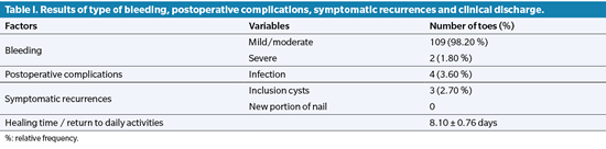 Patients and methods: A retrospective study, with a sample of 111 patients and 159 digits were operated on between 2003 and 2019 in clinics in Vila Nova de Famalicão, Viana do Castelo and Lisboa (Portugal), with a follow-up period of more than 15 years. Data on: a) postoperative complications, b) the time elapsed to wound healing, c) the rate of recurrences, and d) general patient satisfaction were collected.