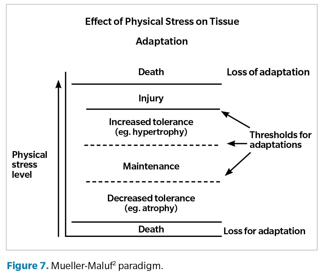 Mueller and Maluf’s paradigm(2) describes the effects of physical stress on musculoskeletal tissues under low or high stress levels. It defines optimal physical stress thresholds, with the musculoskeletal system adapting in five ways: atrophy, maintenance, hypertrophy, rupture, or death. Excessive stress can cause either significant atrophy or hypertrophy, leading to overuse injuries. During recovery, applying submaximal stress stimulates tissue repair; without stress, tissue atrophy occurs. Müller outlines physiological thresholds that influence recovery positively or negatively. Overuse injuries arise via three mechanisms: high magnitude stress over a short duration, low magnitude stress over an extended period, or moderate magnitude stress applied repeatedly (Figure 7).