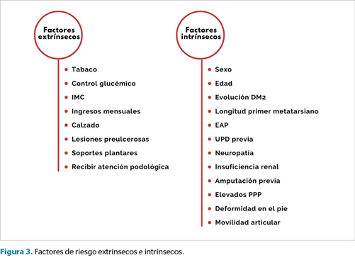 En primer lugar, comenzando con los FR intrínsecos, se exponen los caracteres propios del paciente, tales como el sexo (masculino), la edad (60-75 años) y la duración de la DM tipo 2 (duración: más de 20 años). Se trata de FR destacados en un número limitado de artículos y, de los cuáles, factores como el sexo y la edad se encuentran excluidos como FR en la reulceración de PD en diversos estudios7-9,14, por lo cual en esta revisión tampoco van a ser calificados como FR significativos.