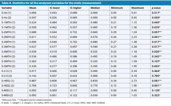 Table IV shows the descriptive analysis, as well as the number of patients (n) considered in each case. The relationship between weight change and pressure change was studied using the Spearman correlation coefficient. In static, it is observed that the weight variation is statistically significant in the pressures of the Hallux, 1st MTH, 2nd MTH, 3rd MTH and 4th MTH. In dynamics between Session 1 and Session 2we found only a significant association between pressure changes and weight variation in the 2nd to 5th toes and midfoot.