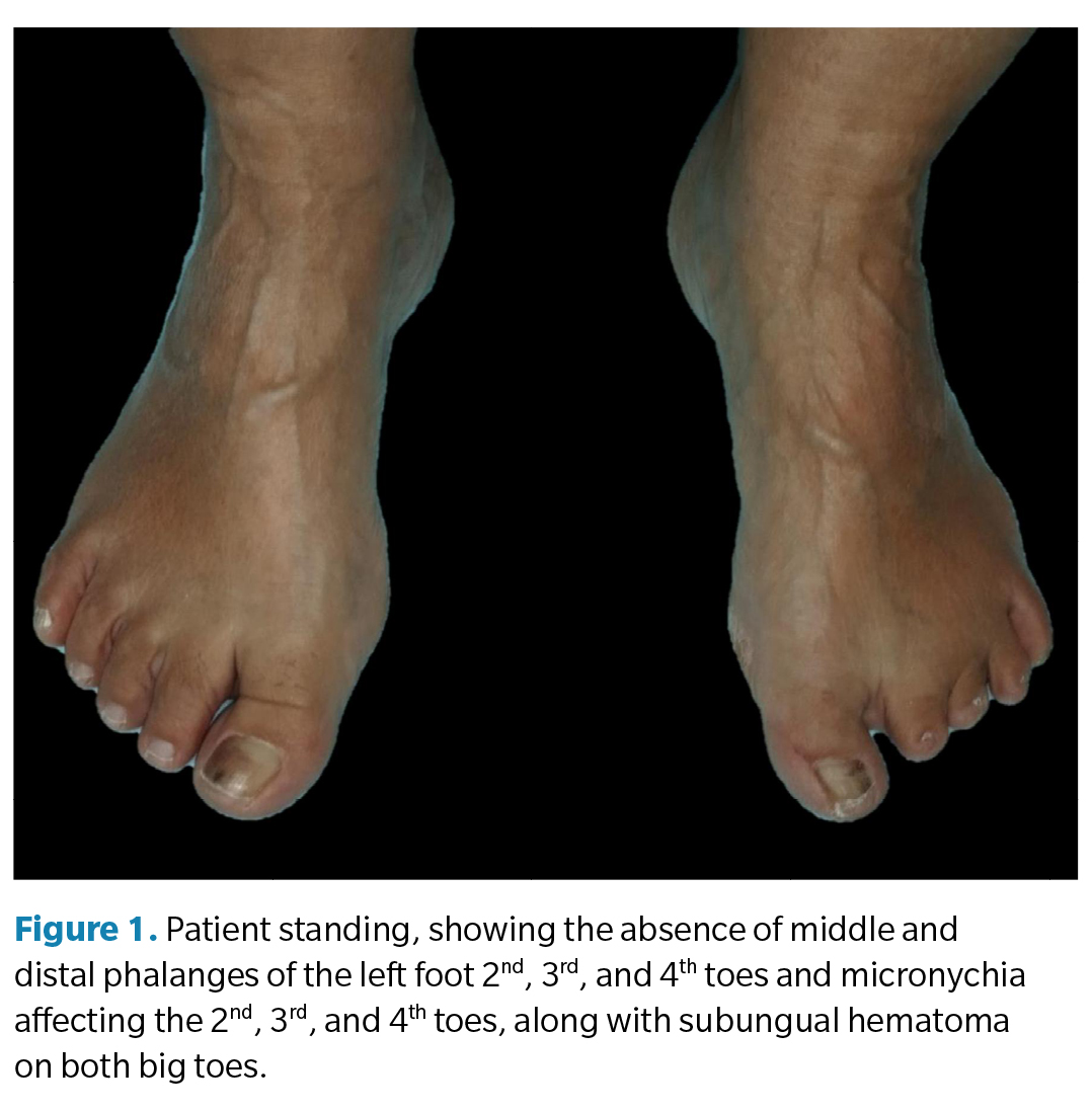 Figure 1. Patient standing, showing the absence of middle and distal phalanges of the left foot 2nd, 3rd, and 4th toes and micronychia affecting the 2nd, 3rd, and 4th toes, along with subungual hematoma on both big toes.